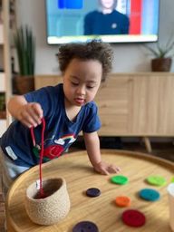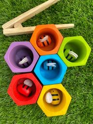 An absolute classic of a toy that gives so much more than just the fine motor skills developed when first picking up and moving the bees with fingers and then transitioning to using the tweezers. You can also use it for colour matching, counting, stacking, and memory games etc.